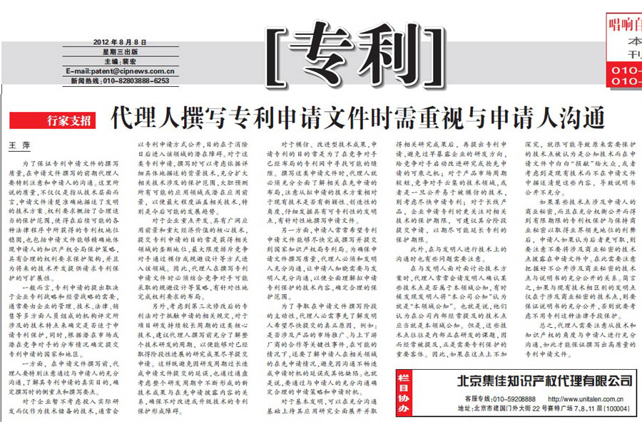 《中國知識產權報》:代理人撰寫專利申請文件時需重視與申請人溝通