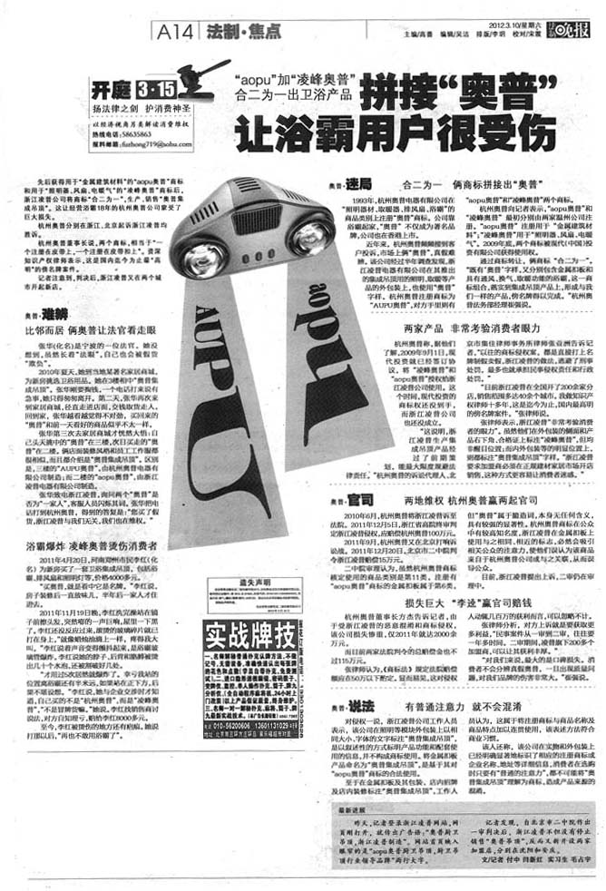 《法制晚報》:拼接'奧普"讓浴霸用戶很受傷