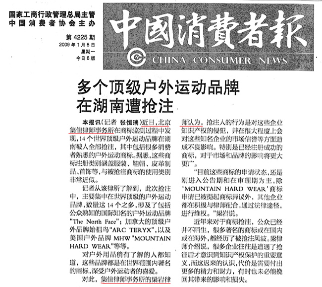 《中國消費者報》:多個頂級戶外運動品牌在湖南遭搶注
