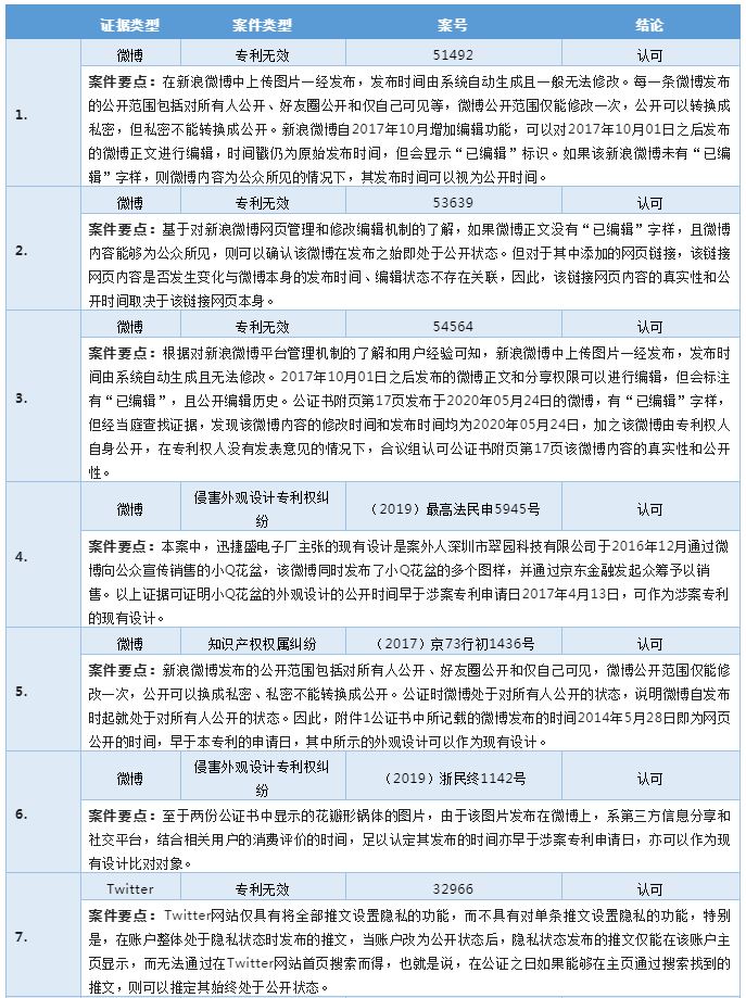 社交網絡類平臺及相關軟件應用因其用戶交互模式的易用性及便捷性擁有數量極為龐大的用戶,由此產生的海量信息中往往蘊含可用作認定為現有技術的證據。常見的社交網絡平臺包括新浪微博、微信公眾平臺、微信朋友圈、Facebook、Twitter等,而不同類型的社交平臺其隱私功能,已發布信息修改功能均有所不同。比如新浪微博用戶在發表微博時,存在私密權限和公開權限的設置,微博公開范圍可以從公開轉成私密,但私密不能轉成公開。而微信朋友圈的公開范圍可以在公開與私密間來回切換且不會影響發布時間,也不會留下編輯痕跡。因此,在實踐中認定此類社交網絡類證據是否構成專利法意義上的公開時,主要的考量的重點為公開性及公開時間。下表是認定社交網絡平臺類網絡證據的案例梳理。