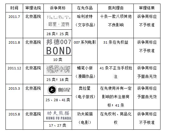 對于這種權利沖突類型,最初因缺少明確的法律規制,對在先作品名稱不予保護的情況并不少見;但隨著遏制惡意搶注的加強,商標禁注的“絕對條款”開始被適用,比如援引“其他不良影響”條款不予注冊的“哈里波特”,再比如援引“不正當手段搶注”條款不予注冊的“蠟筆小新”。但用“絕對條款”保護相對權利畢竟有些名不正言不順,北京高院藉由“邦德007”、“功夫熊貓”兩案,首次將在先影視作品名稱、角色名稱作為在先權益進行保護,引導適用“相對條款”而不是“絕對條款”來解決這種沖突。在此期間,也有類似“奧拉星”的案件,適用“在先使用并有一定影響的未注冊商標”條款來保護在先游戲名稱。本文附表一總結了近年來北京法院在商標授權確權類案件中保護在先各類作品名稱的情況,供讀者參考。