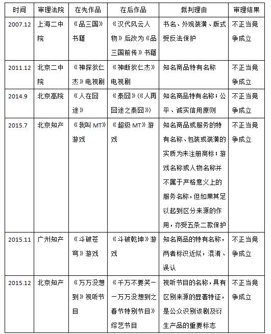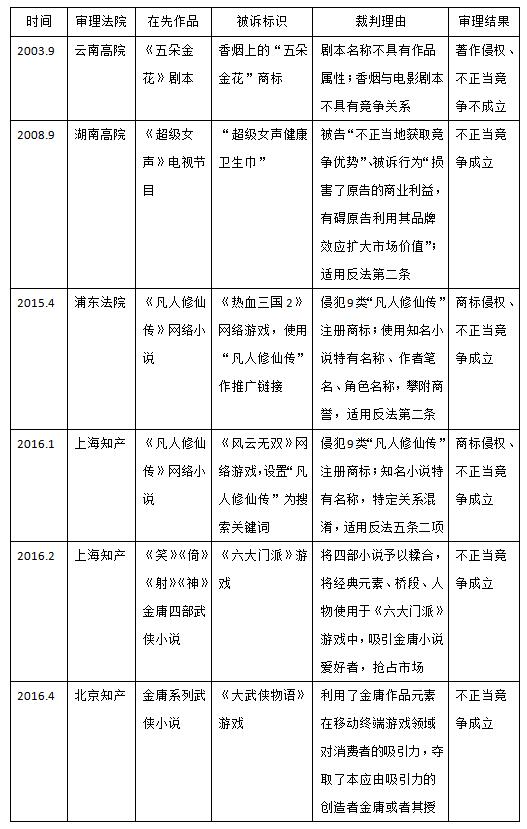 這種類型的案件目前數量不多,但可以預見,將文化轉化為商業力量已經是文化傳媒產業的大趨勢,隨之而來的類似案件將會急劇增加。從已決的案件結果看,對于在先作品名稱的商業化利用問題,司法判決已經從不保護逐漸轉向保護;在法律適用方面,較多的案例引用反不正當競爭法第二條的一般條款進行判決,也存在個案適用反不正當競爭法第五條第二項。筆者認為,將他人在先作品名稱作為自身商品或服務的標識使用,確實可能會使人誤認為該商品或服務與作品權利人之間存在授權許可、合作等特定關系,但這種認知不同于商品或服務來源的混淆,與反法仿冒意義上的混淆、誤認還是存在明顯區別。何況,反法第五條的保護范圍通常是在類似商品或服務的范圍之內,將這一條款擴大適用到作品的衍生商品或服務范圍,稍顯牽強。因此,在反法第五條修改之前,適用第二條一般性條款似乎更為適當。本文附表五總結了此類案件的審理情況,供讀者參考。