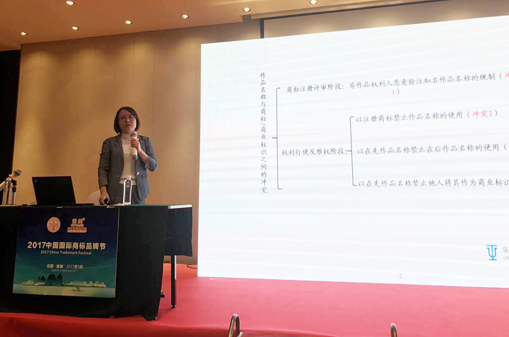 ▲侯玉靜律師通過總結(jié)近年來審判結(jié)果,闡述作品名稱與商標(biāo)的權(quán)利沖突及解決