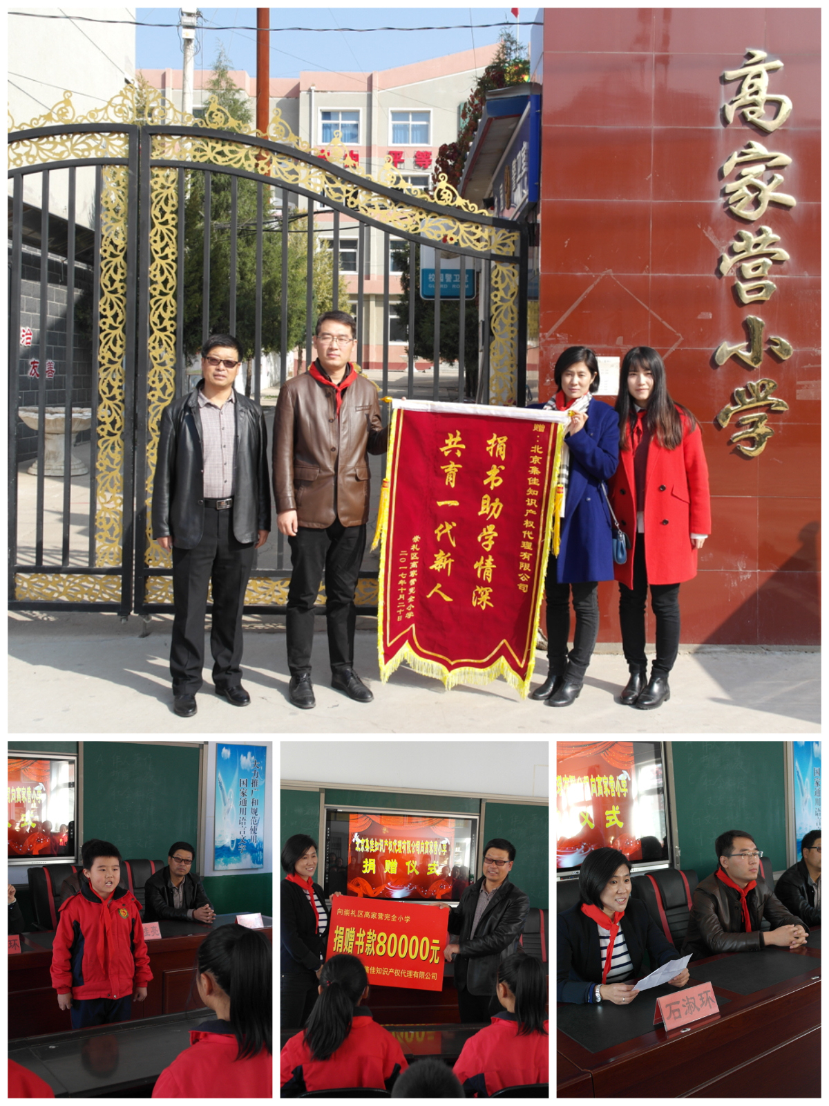在大家熱情的掌聲下,優(yōu)秀的少先隊員們?yōu)殛P(guān)心他們的領(lǐng)導(dǎo)、來賓系上了鮮艷的紅領(lǐng)巾。學(xué)生代表和宋延校長分別發(fā)言,對集佳心系教育、慷慨捐贈的義舉表達了誠摯的感謝。集佳代表石淑環(huán)主任隨后發(fā)言,介紹了集佳公益活動的情況以及本次捐贈活動的初衷,并希望集佳此舉能夠為豐富孩子們的校園生活和拓寬孩子們的視野提供幫助。在這些發(fā)自內(nèi)心的仍帶著稚嫩童聲的歡呼聲中,看似簡單卻意義深遠的捐贈儀式開始,高家營小學(xué)領(lǐng)導(dǎo)向集佳贈送了題為“捐書助學(xué)情深,共育一代新人”的錦旗。