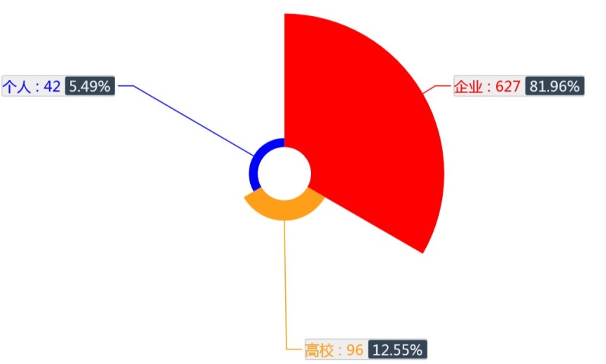 本屆專利獎獲獎專利中,企業專利627件,占比81.90%,高校專利96件,占比12.55%,個人專利42件,占比僅5.49%