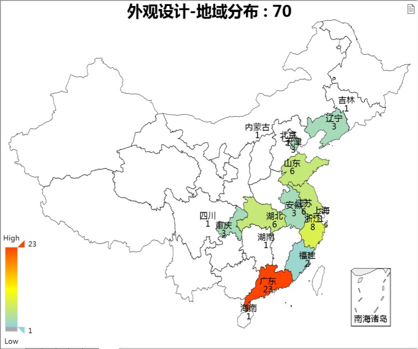 四、獲獎外觀設計集中在東部沿海地區 70件獲獎的外觀設計中,超過90%的獲獎外觀設計分布在廣東、浙江、福建、江蘇、上海、山東、北京、天津等東部沿海發達地區。這些地區的加工制造業發達,工業設計實力強勁。