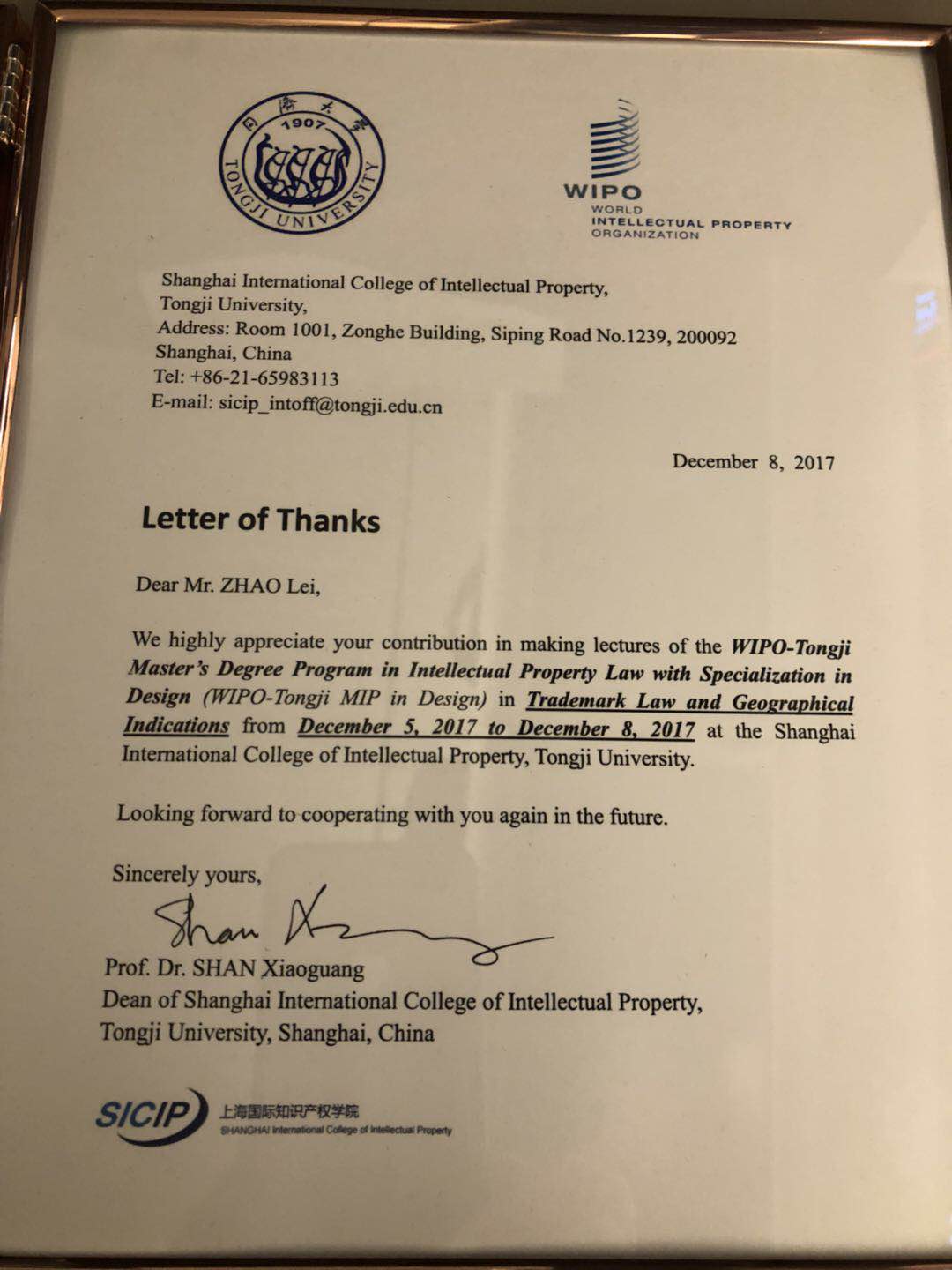 ▲上海國際知識產(chǎn)權(quán)學院聘書