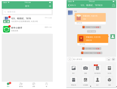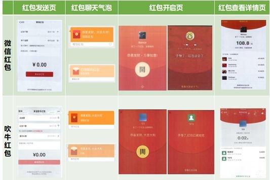 騰訊公司主張“吹牛”軟件中提供紅包收發(fā)服務(wù),在紅包發(fā)送接收全過程中所使用的紅包發(fā)送頁、聊天氣泡、開啟頁、查看詳情頁等界面全面抄襲、模仿騰訊公司“微信紅包”相關(guān)界面。此外“吹牛”軟件中還使用與“微信”軟件底部界面“聊天、通訊錄、發(fā)現(xiàn)、我”圖標高度近似的圖標等。上述行為涉嫌侵犯騰訊公司相關(guān)作品著作權(quán),并構(gòu)成不正當(dāng)競爭。