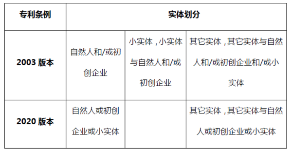 (1)新修訂條例取消了現(xiàn)行的自然人/初創(chuàng)企業(yè)、小實體和其它三種分類方式,不再將小實體進行單獨分類,取而代之的是將申請人的認定分為如下兩種:
