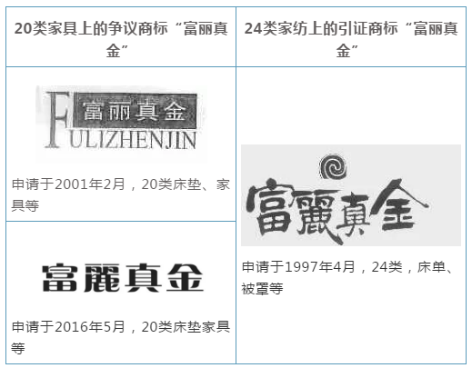 在上述不正當(dāng)競(jìng)爭(zhēng)糾紛取得勝訴之后,富麗真金家紡先后針對(duì)富麗真金家具兩枚注冊(cè)商標(biāo),提起無(wú)效宣告。