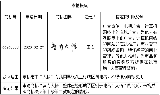 其次,“大悟縣”雖然是隸屬于湖北省孝感市轄區下的一個縣級城市名稱,但其作為縣級城市名稱并不被廣大消費者所熟知,當普通消費者看到“大悟”二字時,想到是“大悟”二字本身的固有含義,而能夠聯想到“大悟縣”的可能性不高,其不太可能被普通消費者誤認是行政區劃名稱。