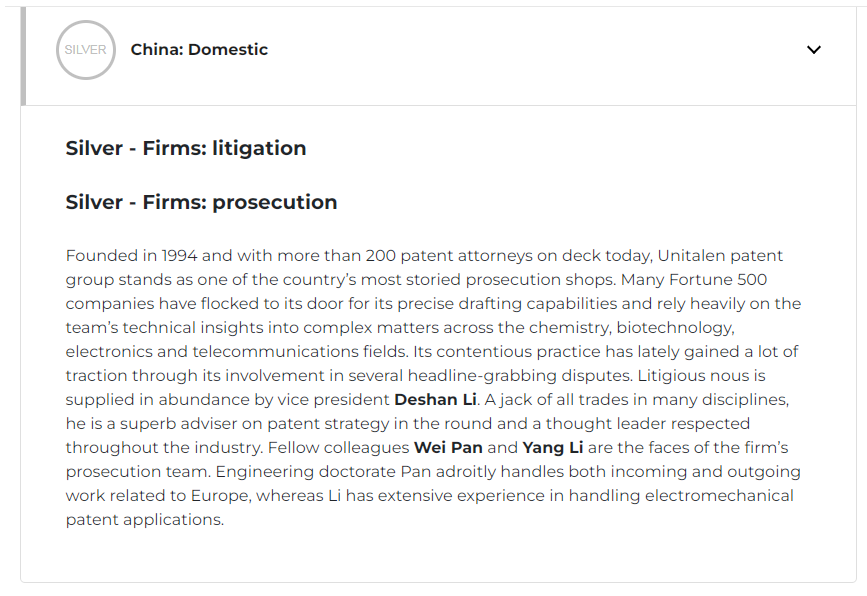 Recently, the international authoritative intellectual property media IAM (Intelligent Asset Management) announced the selection results of the "IAM Patent 1000" in 2023. With outstanding performance in the patent field and widespread recognition from customers, Unitalen has been on the list of the annual recommended firms in the fields of "patent right verification" and "patent litigation" for 9 consecutive years. At the same time, vice president LI Deshan, a partner of Unitalen, was awarded with an outstanding individual in the fields of "patent litigation" and "patent right verification", while vice president LI Yang and Dr. PAN Wei, both being partners, were on the outstanding personal recommendations list with glory in the field of "patent right verification".