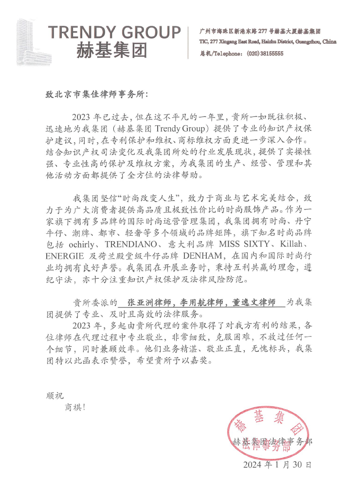 信中提到,2023年,集佳與赫基集團(tuán)在專利保護(hù)和維權(quán)、商標(biāo)維權(quán)方面更進(jìn)一步加強(qiáng)合作,集佳一如既往、迅速地為赫基集團(tuán)提供了專業(yè)的知識(shí)產(chǎn)權(quán)保護(hù)建議,集佳提供的實(shí)操性強(qiáng)、專業(yè)性高的保護(hù)及維權(quán)方案,為赫基集團(tuán)的生產(chǎn)、經(jīng)營、管理和其他活動(dòng)方面都提供了全方位的法律幫助。赫基集團(tuán)法務(wù)部贊揚(yáng)集佳張亞洲律師、李用航律師、董逸文律師、徐思律師、商標(biāo)代理人杜夢寒等,在提供專業(yè)、及時(shí)且高效的法律服務(wù)的過程中,厚德重法,業(yè)務(wù)精湛,敬業(yè)正直,無愧標(biāo)兵。