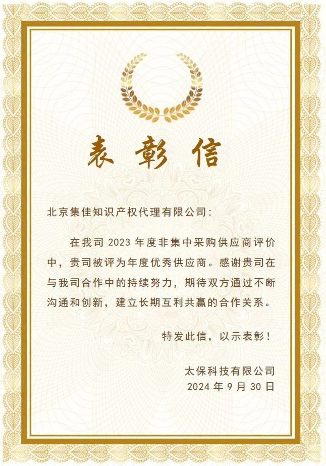 近日,集佳喜獲客戶太保科技有限公司的表彰信,授予集佳“年度優秀供應商”榮譽稱號,感謝集佳在與太保科技合作中的持續努力,并期待雙方通過不斷溝通和創新,建立長期互利共贏的合作關系。