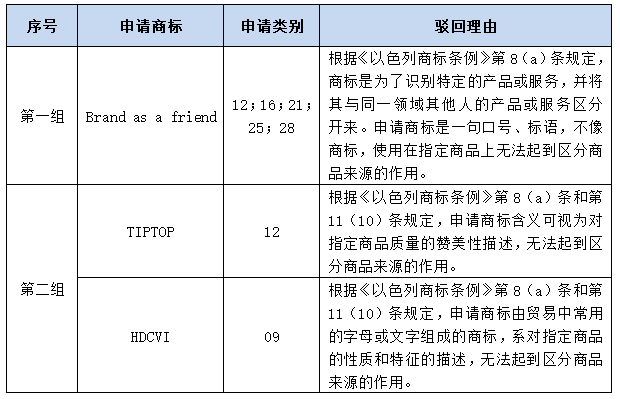 第一組商標(biāo)系因類似于標(biāo)語、口號而非商標(biāo)標(biāo)識而被認(rèn)定缺乏顯著性并駁回。如上所示,商標(biāo)“Brand as a friend”含義為“以品牌為友”,相較于被消費者識別為商標(biāo)標(biāo)識,更容易被識別為一句口號、標(biāo)語,無法將其指定商品與同一領(lǐng)域其他人的產(chǎn)品或服務(wù)區(qū)分開來,故因缺顯被駁回。