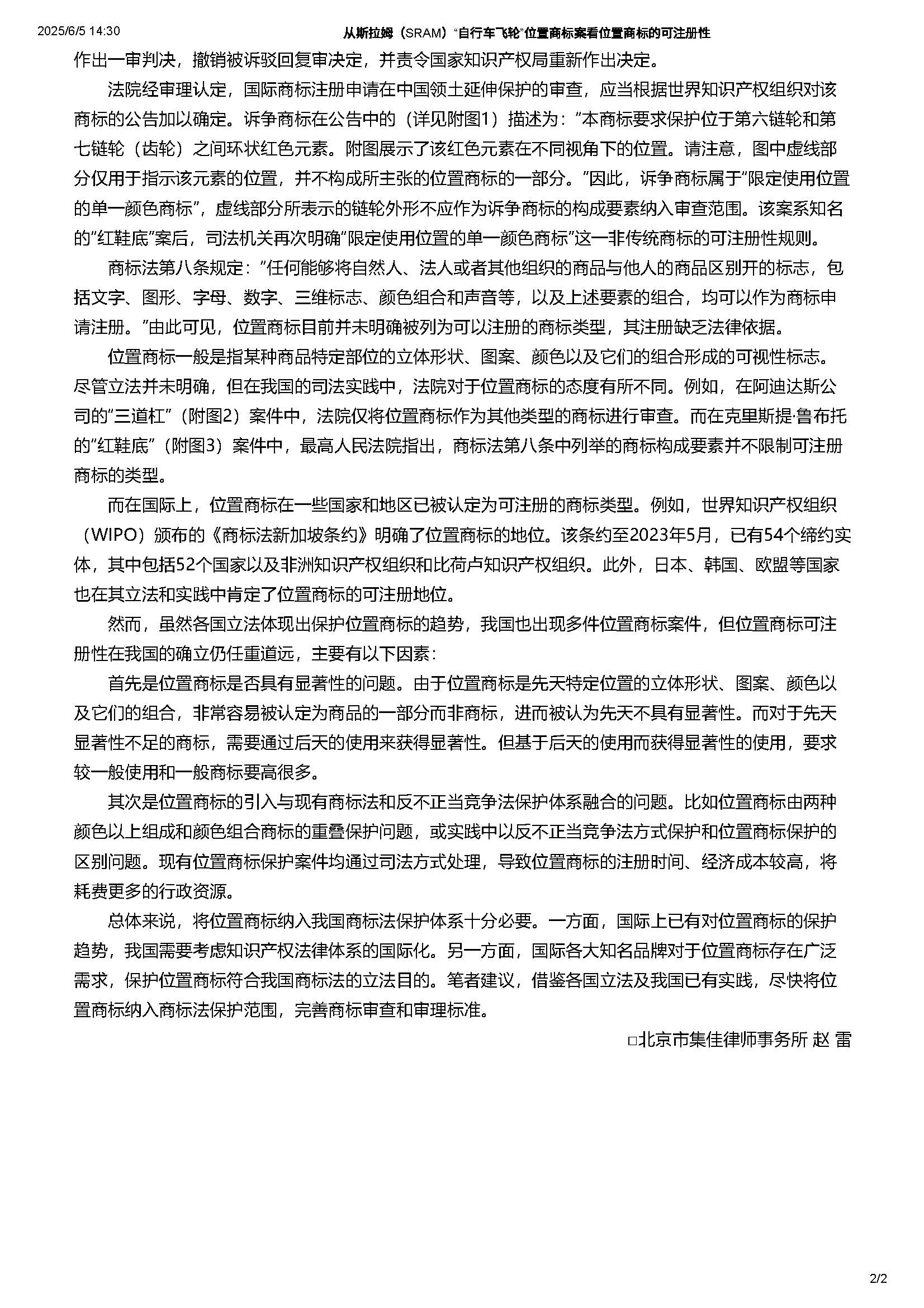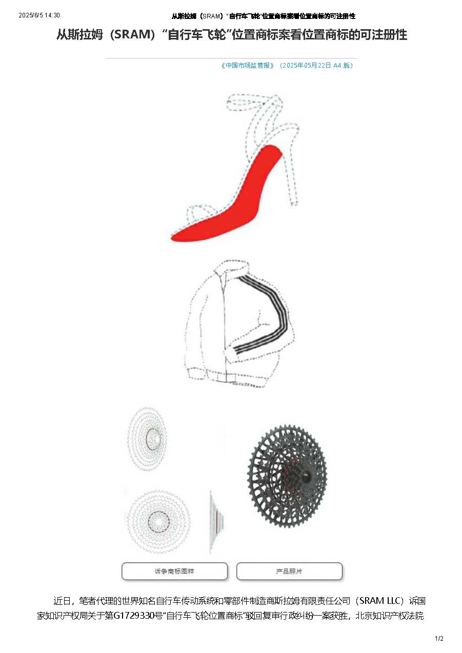 集佳文章《從斯拉姆(SRAM)“自行車飛輪”位置商標案看位置商標的可注冊性》在《中國市場監管報》發表