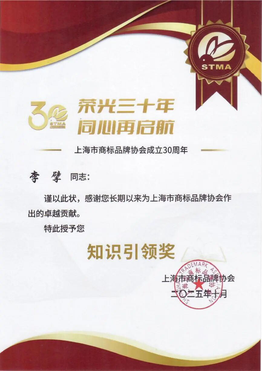 2025年10月16日,“榮光三十年·同心再啟航”上海市商標品牌協會成立30周年慶典在上海隆重開幕,會上表彰了對商標品牌領域作出突出貢獻的單位及個人,表彰了2024-2025年度典型商標代理案例、典型商標代理案例提名。