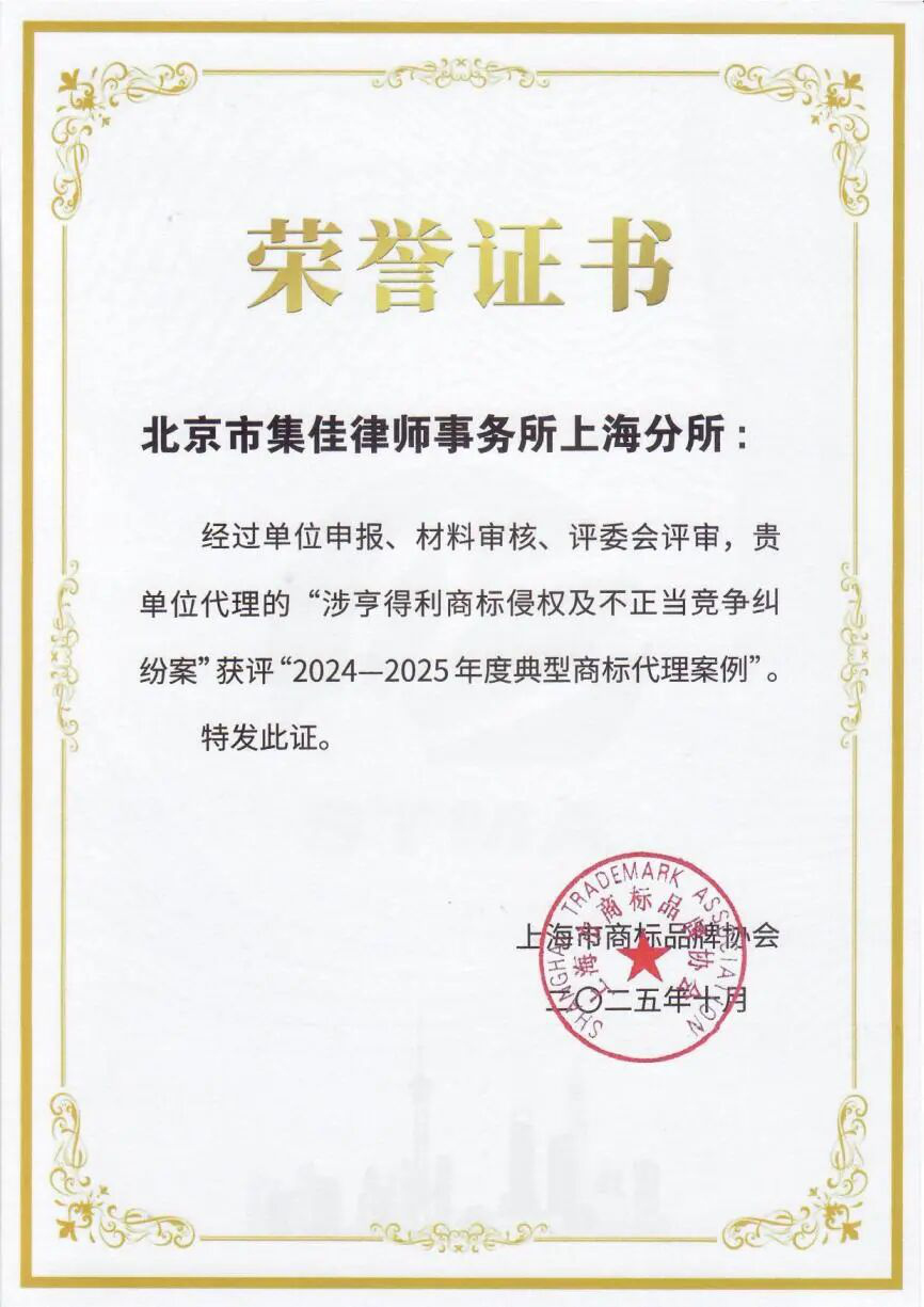 集佳上海分所代理的“涉亨得利商標侵權及不正當競爭糾紛案”獲評“2024-2025年度典型商標代理案例”
