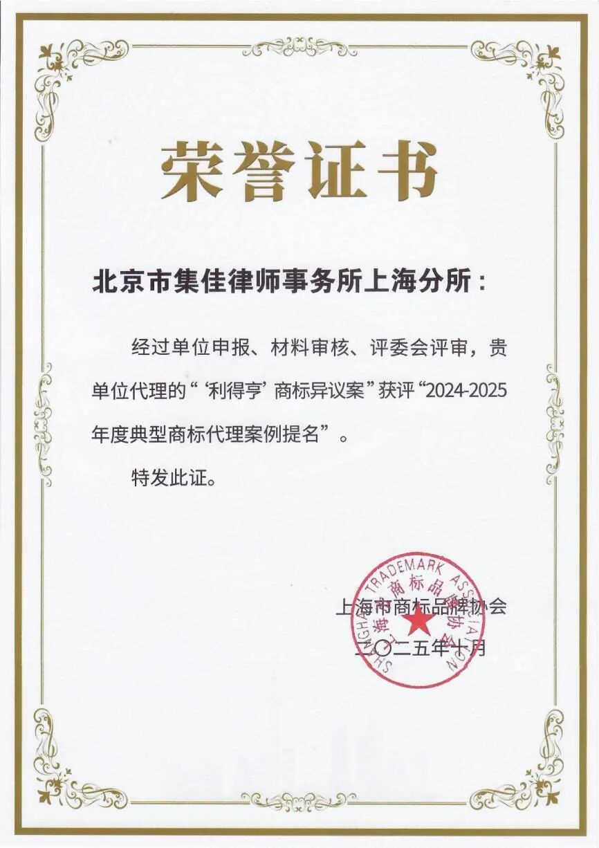 ★ 集佳上海分所辦理的“‘利得亨’商標異議案”獲評“2024-2025年度典型商標代理案例提名”